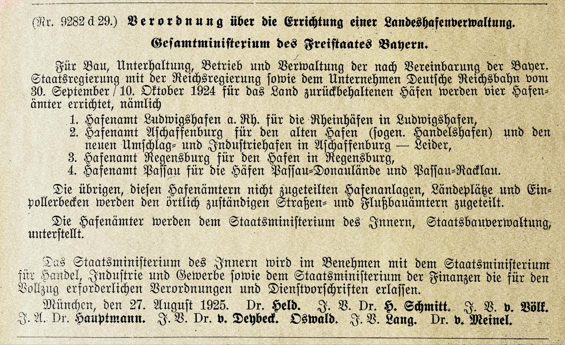 Als nach dem ersten Weltkrieg die Ländereisenbahnen auf das Reich übergingen, stand man in Bayern vor der Überlegung, was man mit den landeseigenen Häfen machen soll. Die Entscheidung diese Häfen unter einem Dach zusammenzufassen war die Geburtsstunde von bayernhafen: Am 27. August 1925 wurden die Hafenämter in Aschaffenburg, Regensburg und Passau sowie Ludwigshafen (vormals bayerisch) eingerichtet und unter dem Dach der „Bayerischen Landeshafenverwaltung“ zusammengefasst.