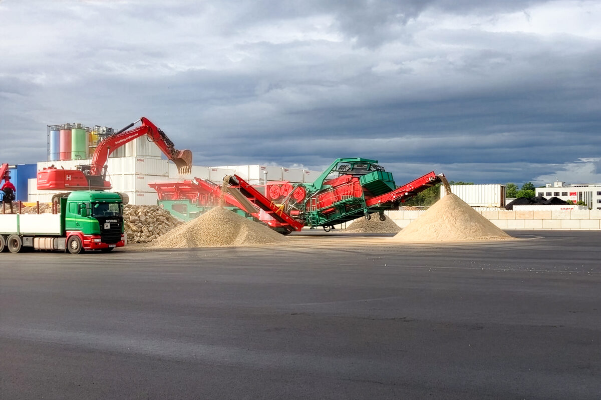 Im Zentrum des Betriebs steht eine leistungsstarke mobile Sieb- und Brechanlage, die Baustoffe auch nach der Ersatzbaustoffverordnung herstellen kann. So werden beispielsweise Abbruchabfälle aufgearbeitet und anschließend als Baustoff für den Markt bereitgestellt. Dabei verfügt die Anlage über mehrere Vorrichtungen, um Fremdstoffe wie Metall, Kunststoff oder Holz zu separieren, um die notwendige Qualität des Endprodukts sicherzustellen. Weiter bricht und verarbeitet die Anlage sogenannten Grobschlag, also größere, noch unbearbeitete Gesteinsstücke aus der ersten Abbauphase in Steinbrüchen, zu hochwertigem Schotter. Dabei umfasst das umfangreiche Produktportfolio perspektivisch eine Vielzahl von Materialklassen und Gesteinskörnungen. Das reduzierte Platzangebot an Kai 3 beschränkt die Produktvielfalt aktuell jedoch noch auf einzelne Recycling- und Schotterprodukte.