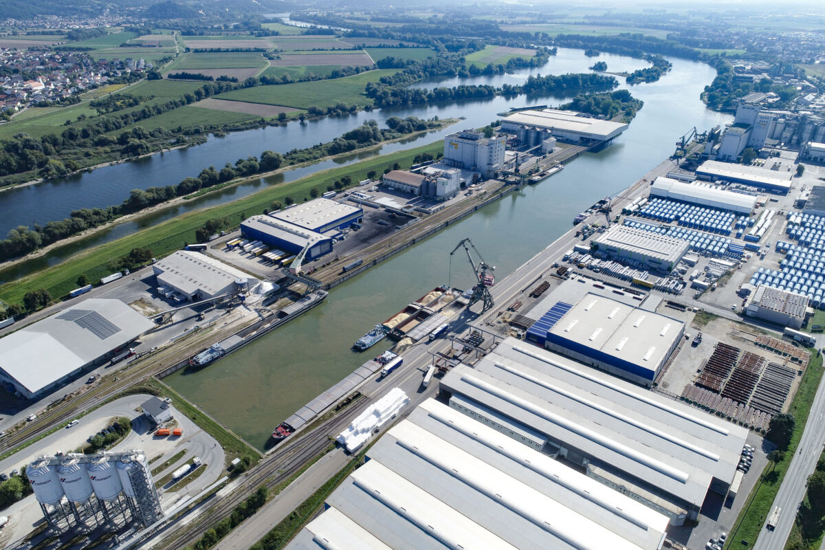 Der kumulierte Bahn- und Schiffsgüterumschlag von bayernhafen beträgt 8,37 Mio. t Güter im Jahr 2025. Rund 487.000 Lkw-Fahrten wurden durch die Verlagerung von Langstreckenverkehren auf die umweltfreundlicheren Verkehrsträger Schiff und Bahn eingespart. (hier im Bild der bayernhafen Regensburg). (Bildquelle: bayernhafen / Michael Ziegler)