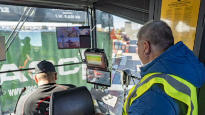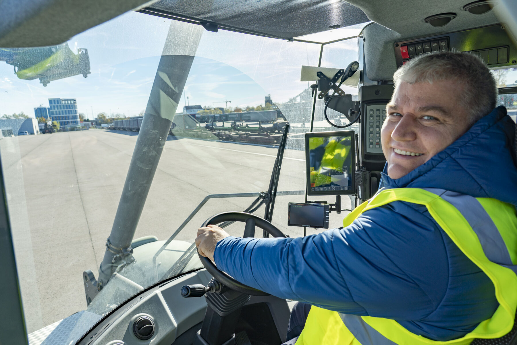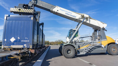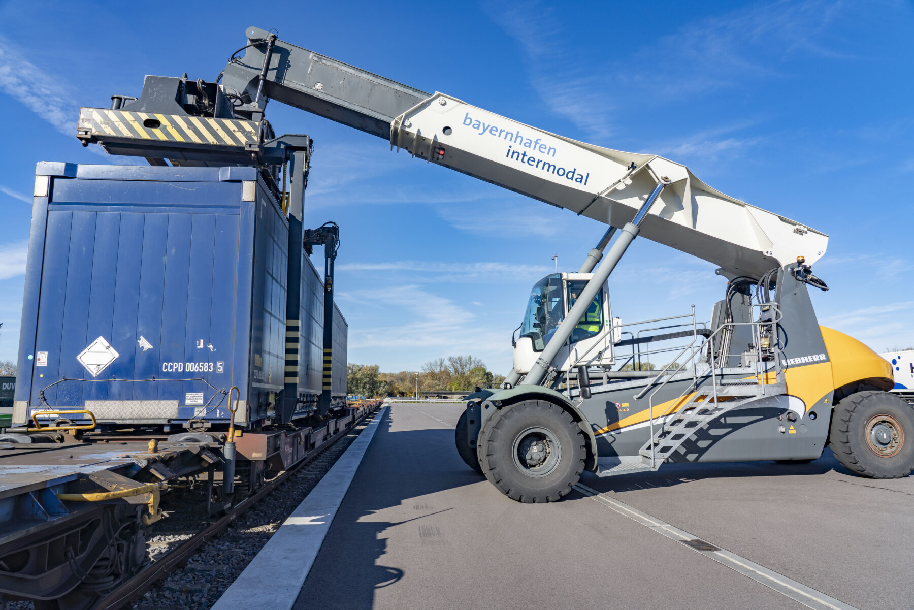 Wie die Verknüpfung der Verkehrsträger und der Güterumschlag praktisch funktioniert, konnte Stefan Schmidt bei den weiteren Praxisstationen erleben und verschiedene Umschlagsvarianten selbst ausprobieren. Im von bayernhafen betriebenen Trailerport T2 fuhr er mit einem Reachstacker und begleitete den Umschlag einer Wechselbrücke und eines Sattelaufliegers. Der Trailerport T2 ist ein speziell für den Umschlag von Sattelaufliegern und Wechselbrücken optimiertes Terminal.