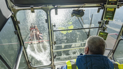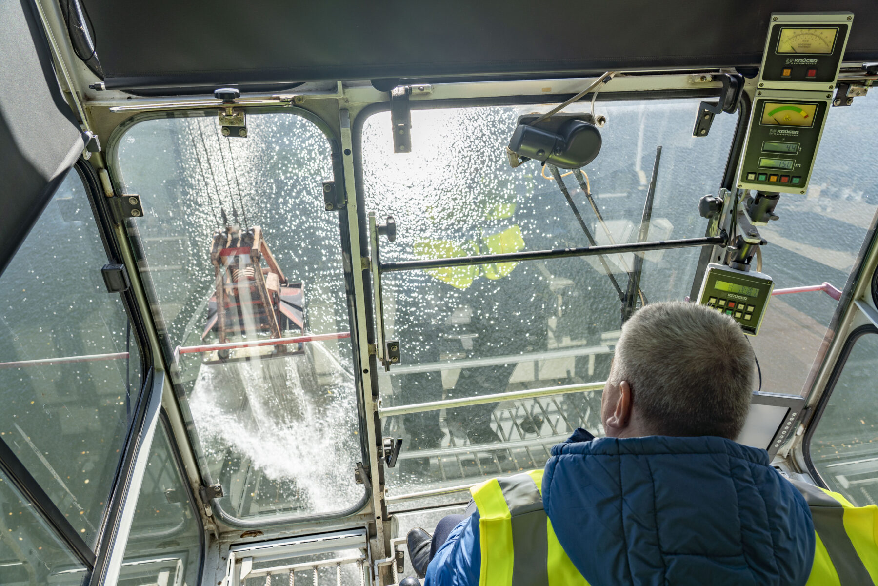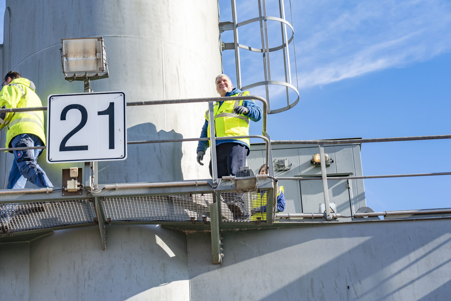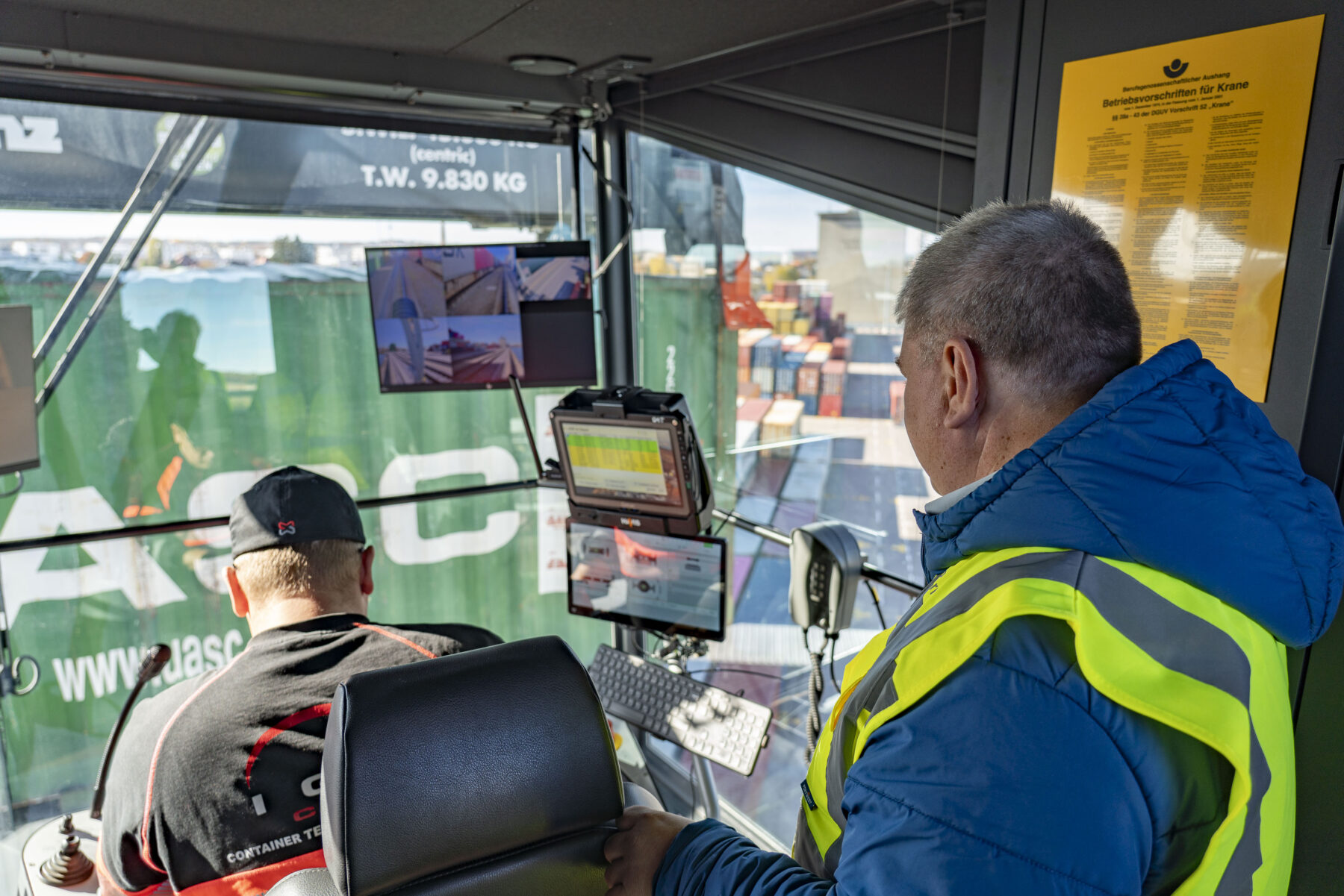Den Abschluss bildete der Aufstieg auf Kran 21 im Westhafen Regensburg. Der Kran gehört mit einer Höhe von 63 Metern und einem Gewicht von über 500 Tonnen zu den „Schwergewichten“ im Hafen. Nach einer kurzen Einweisung durfte Stefan Schmidt selbst in der Krankanzel Platz nehmen und testen, wie mit nur 2 Joysticks das Umschlaggerät zu bedienen ist.