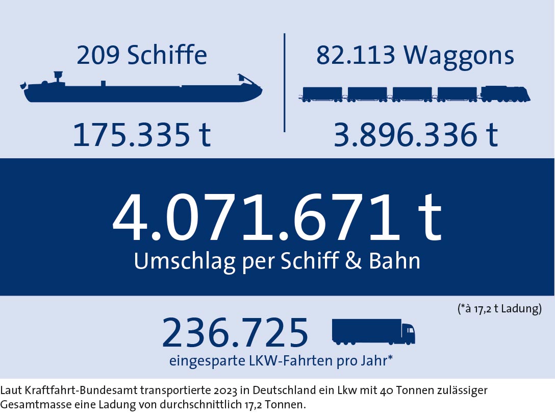 Mit unserer leistungsstarken Infrastruktur eröffnen wir Ihnen einen diskriminierungsfreien und kostengünstigen Zugang zu den drei gleichberechtigten Verkehrsmitteln Binnenschiff, Bahn und Lkw.