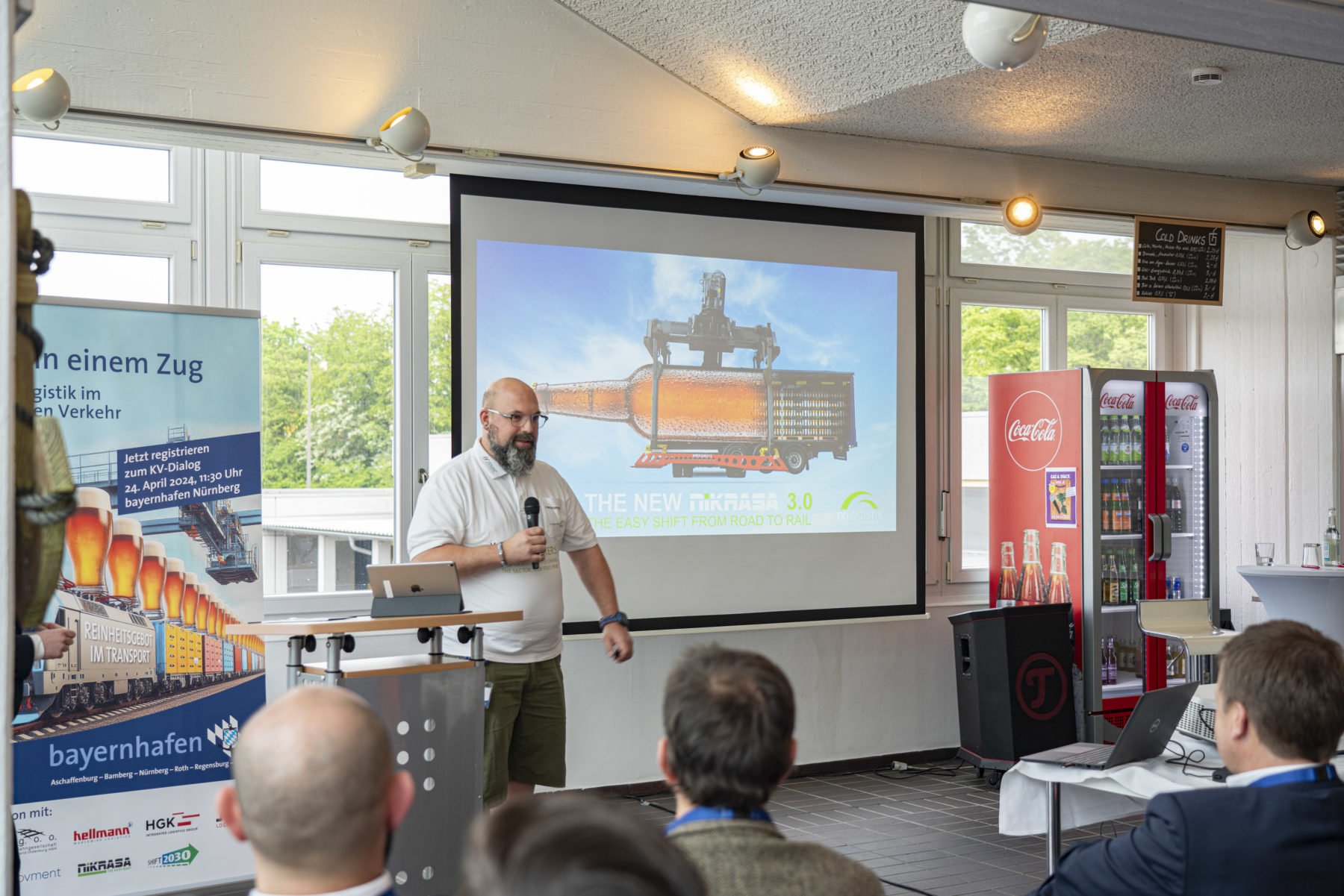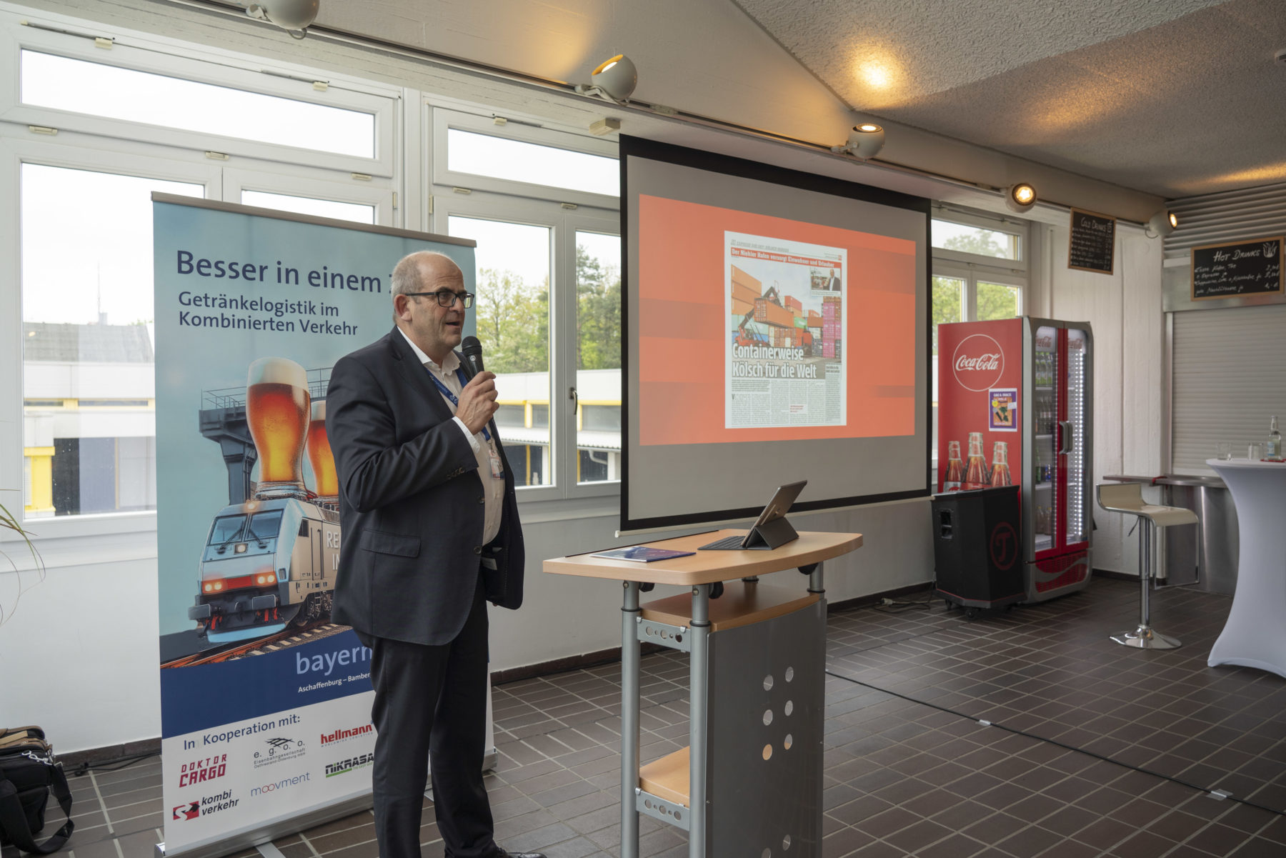 bayernhafen Geschäftsführer Joachim Zimmermann begrüßte die rund 90 Teilnehmer und Gäste und gab die Zielrichtung der Veranstaltung vor: „Das größte Potenzial für den Kombinierten Verkehr liegt im kontinentalen Sektor und damit bei den Trailerverkehren. Getränke auf der Schiene – das hat als erstes Frachtgut der Bayerischen Ludwigsbahn vor fast 100 Jahren funktioniert und das ist auch heute ein spannendes und lohnendes Segment.“