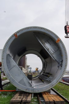 Umschlag eines übergroßen Stahlbauteil für Windkraftanlage