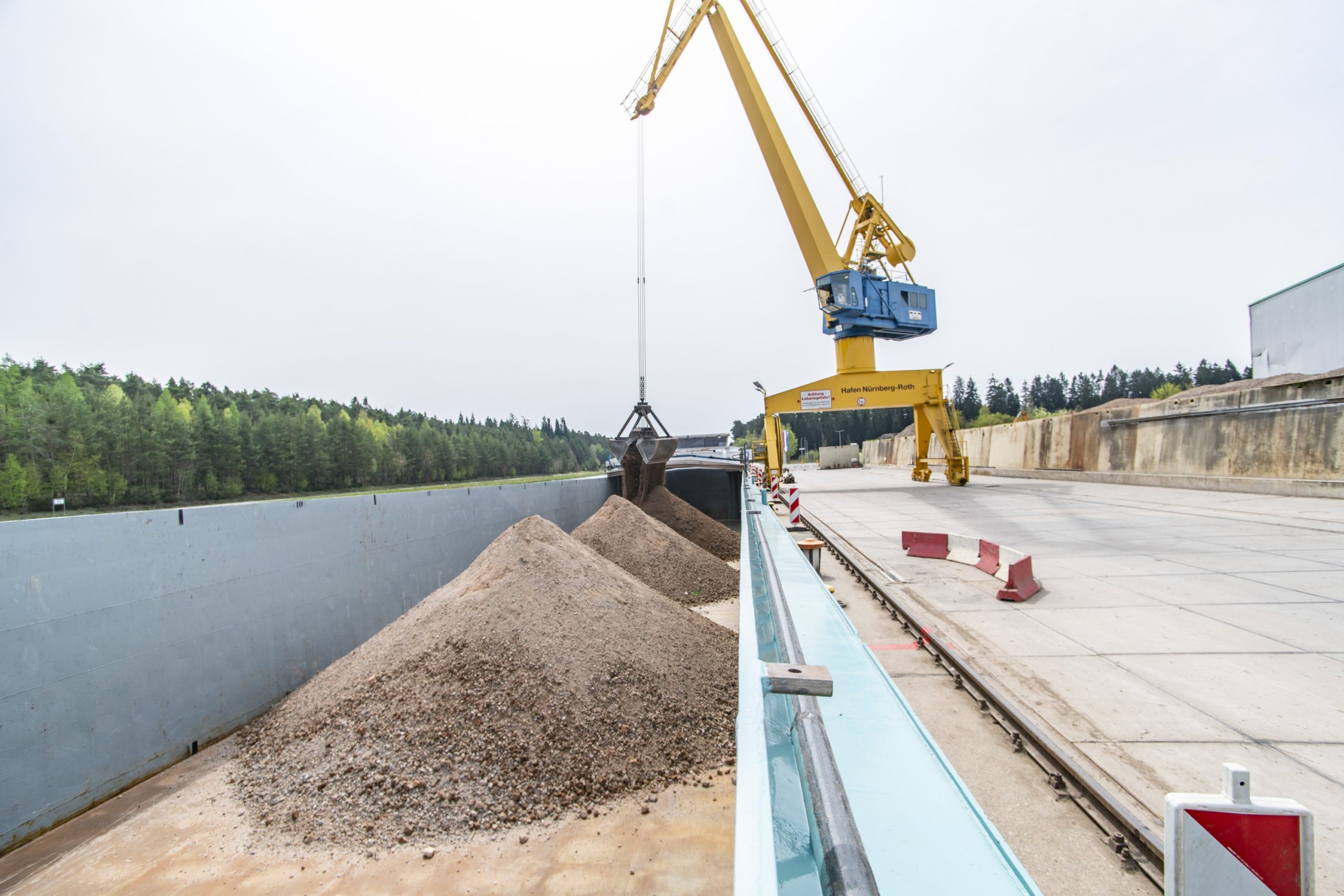 Der Kran des bayernhafen Roth hat Zugriff auf das Grundstück von EZF und kann so die Materialien direkt aufs Binnenschiff verladen.